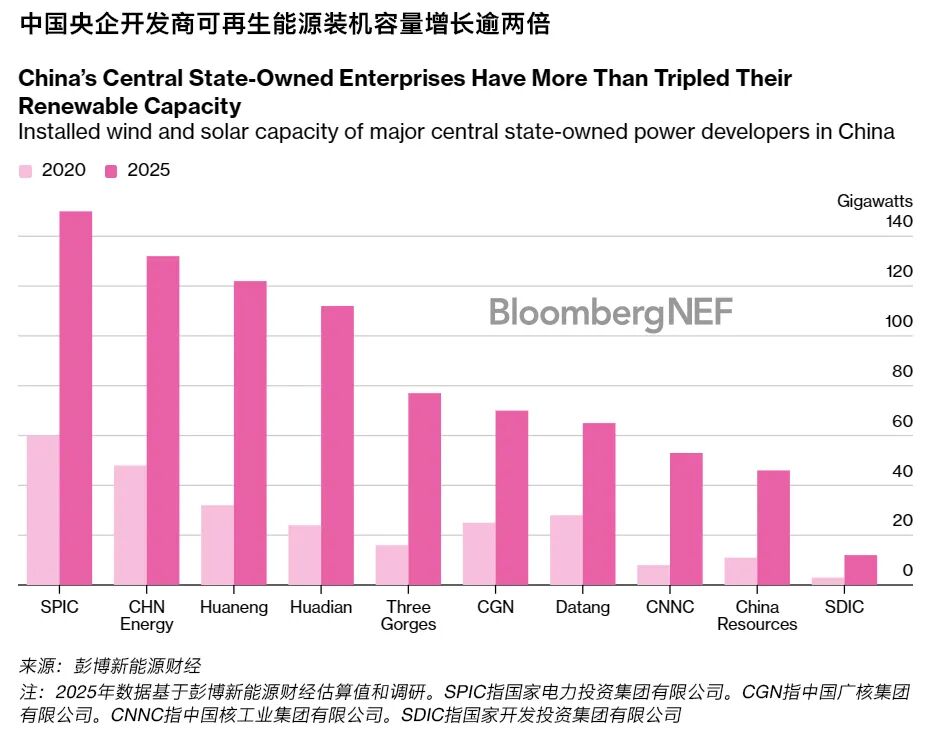 中国央企开辟商在2021-2025年风电和光伏新增装机中的占比