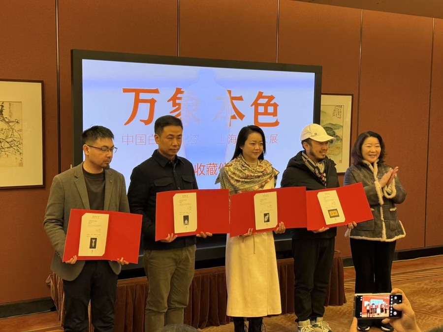 德化县委常委、宣传部部长黄世兴表示,德化县委、县政府正不遗余力地支持陶瓷艺术创作与文化交流,将每一次展示都视为塑造品牌、传播价值的宝贵机遇。2025年德化县委与上海美术馆签署了战略合作协议,立志在展览策划、学术研究、品牌推广等方面开展长期深度合作。此次精心遴选并入藏上海美术馆的39件(组)陶瓷作品,能够成为双方战略合作的首个重要结晶,推动“万象本色”展览精神的延续与升华。上海美术馆党委书记、执行馆长王一川向德化艺术家代表颁发收藏证书。