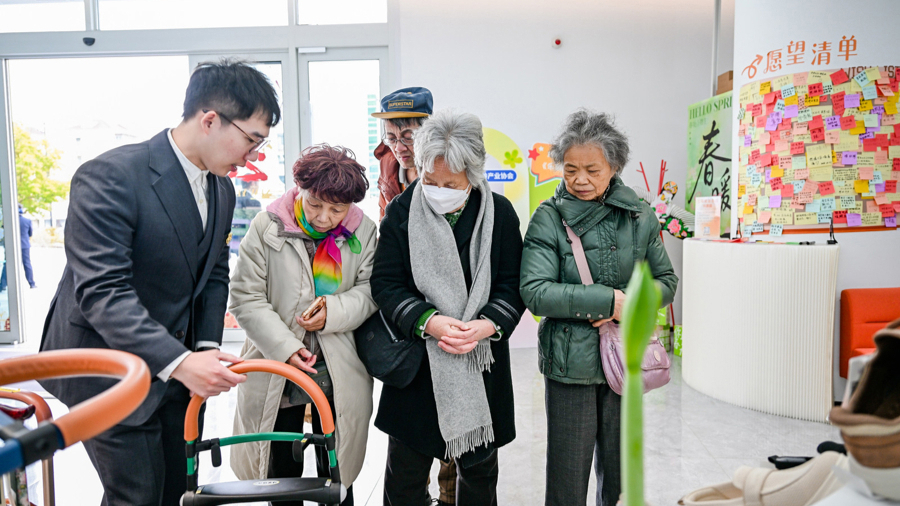 上海银发商店职责主说念主员在为老东说念主先容商品。