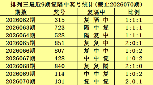 上期回来:成列三第2026070期奖号为:131。大小比为0:3,奇偶比为3:0,012路比为1:2:0。