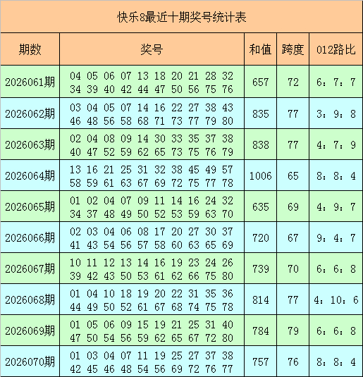 兴隆8第2026070期奖号为:01 03 04 07 11 19 25 27 37 38 42 45 46 48 54 56 69 72 76 77,其中奖号012路比为8:8:4,和值为757,跨度为76。