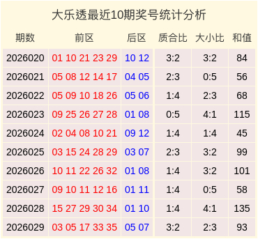 质合分析:上期前区质合比为3:2,最近10期前区号码质合比为15:35,合数出现的概率较高。本期展望合数出现的概率较高,保举质合比为2:3。