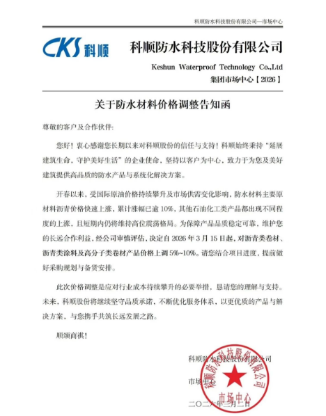 2026年3月的这场集体调价,不应仅被解读为搪塞成本之痛的无奈之举,它更像是一声发令枪,宣告防水行业适应告别无序竞争的低质料旧周期,迈开了向“价值创造”转型的重要一步。这条路谈阻且长,但头部企业的这次联袂,无疑为行业重塑健康生态开了一个好头。