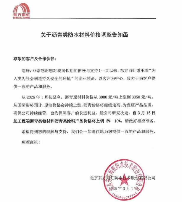 3月1日,东方雨虹领先发布公告,晓示自3月15日起对工程端沥青类卷材和沥青类涂料家具价钱上调5%-10%,这亦然该企业继2025年12月针对JS-11型家具提价后,短短三个月内的第二次调价,突显出成本端的赓续承压。3月2日科顺股份发布调价函,将调价范围遮盖至沥青类卷材、沥青类涂料及高分子类卷材家具,一样以5%-10%的涨幅于3月15日推行;北新防水推出全品类调价决策,沥青卷材、高分子卷材、涂料类家具均上调5%-10%于3月15日推行。