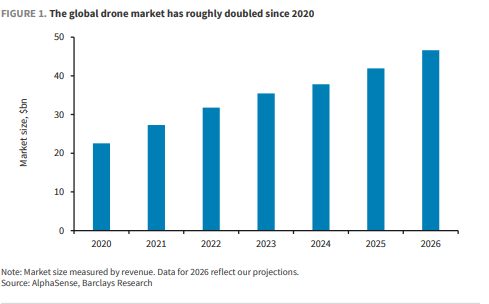 据追风交游台,巴克莱主题FICC经营分析师Zornitsa Todorova在最新敷陈中暗意,往日五年大家无东谈主机阛阓规模从约200亿好意思元(2020年)翻倍到400亿好意思元以上(2025年),展望2026年将到500亿好意思元,2035年的阛阓体量指向2500亿好意思元。