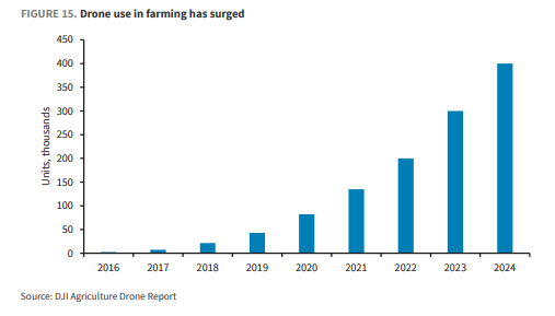 农业:到2024年底,DJI推断其农业无东谈主机大家活跃保有量约40万台(2020年约8万台);如果按相同增长速率外推,2035年农业无东谈主机机队可能接近350万台。喷洒场景的案例长远:相对东谈主工职守喷洒成本可降约70%,相对迷糊机喷洒可降约50%;时候镌汰90%以上,用水降约90%。