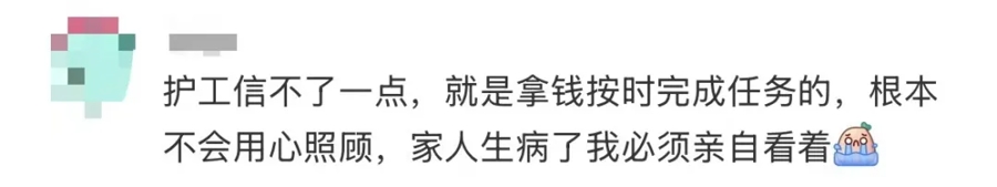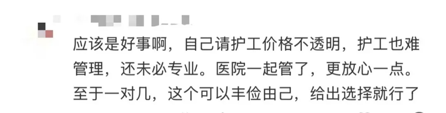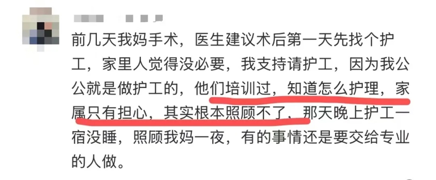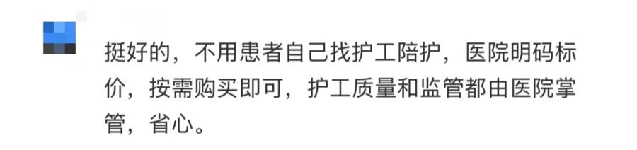 不少网友示意:免陪照护明码标价、病院监管、省去了找护工、谈价艰难。专科照顾员受过培训,比家属更懂照顾,能贬责术后康复、卧床络续等难题。
