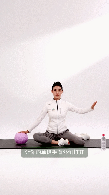 作为模范:左腿向外侧绽开,右腿向内收(作念不到此坐姿可改为盘腿坐)。坐骨向下坐实。单侧手向外侧绽开,将小球放在手掌下向下压住。呼气时,另一侧手向远推延长,感受侧腰通盘拉伸;吸气时再收回。